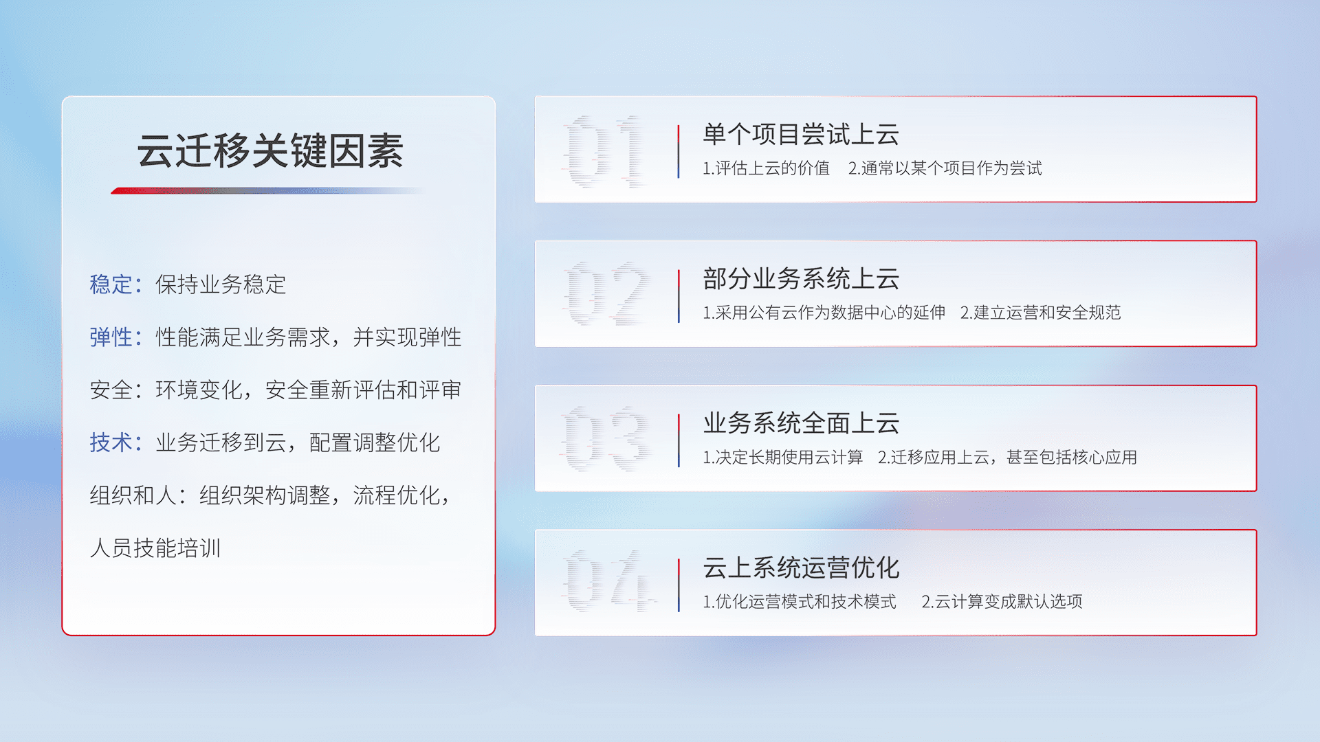 结合实际业务,,,从规划设计、、、、云平台选型、、、、云原生改造、、、数据迁移、、、集成交付,,,,迁移全过程为客户识别最佳上云路径,,做好风险识别管理,,,,设计网络架构、、、身份权限、、、安全审计合规、、、、操作审计、、日志审计、、、监控告警策略、、、、多站点容灾设计等,,,,对云上基础设施进行整体规划,,,,提升IT治理水平,,以满足弹性、、高可用、、、、高性能的需求。。。