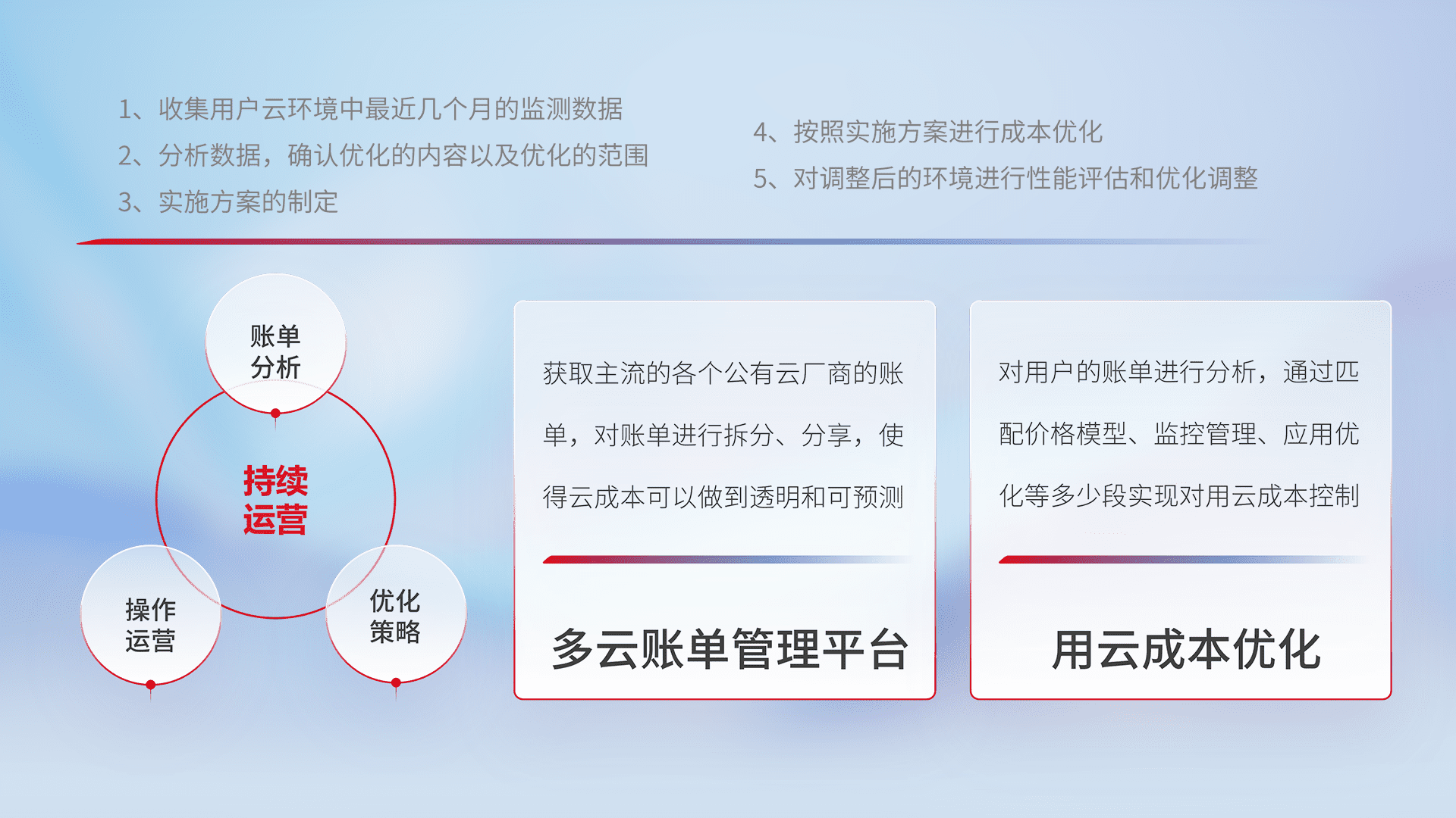 通过多云纳管,,,以统一的资源数据模型把客户的云资源进行抽象和封装,,,,进而实现对多云资源的统一操作,,,保障云资源管理的可靠性、、、、稳定性与可用性。。。量身定制化运维内容,,,配置、、、、开发运维、、补丁管理、、、备份、、、、监控、、认证和访问管理、、、、审计和日常巡检等,,,,保障在用云过程中的可靠度,,,稳定度以及高可用率。。。